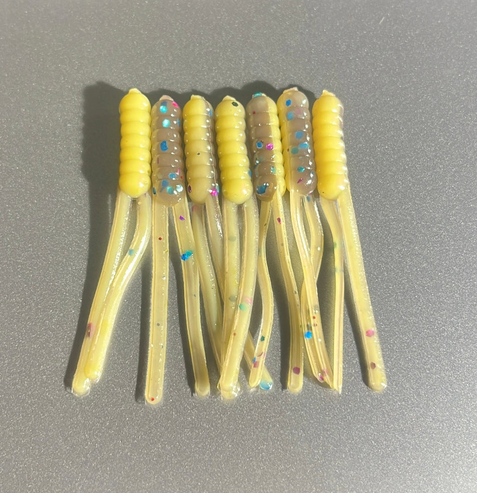 The GT Flash Split Tail packs serious visibility with a vibrant yellow side and a natural grey side loaded with blue and red flake. That combination throws off a multicolor flash signature that mimics injured minnows, shiners, and hatchery feed — a deadly trigger for trout, crappie, panfish, and finesse bass.