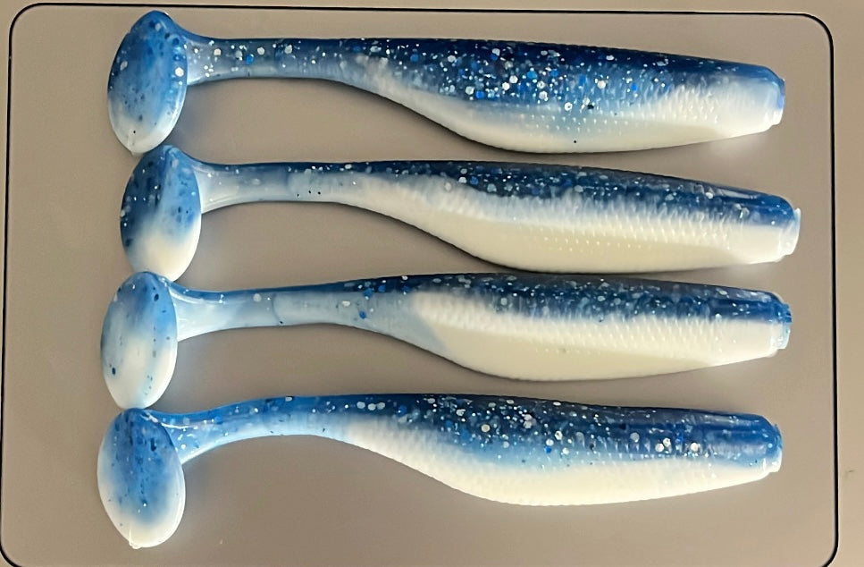 Cold, clean, and deadly — the Icewater 4” paddle tail is built to fool the wariest predators. Featuring a crisp white belly with a frosty blue back, accented by silver and blue flake, this bait delivers the perfect baitfish illusion with just the right amount of flash.