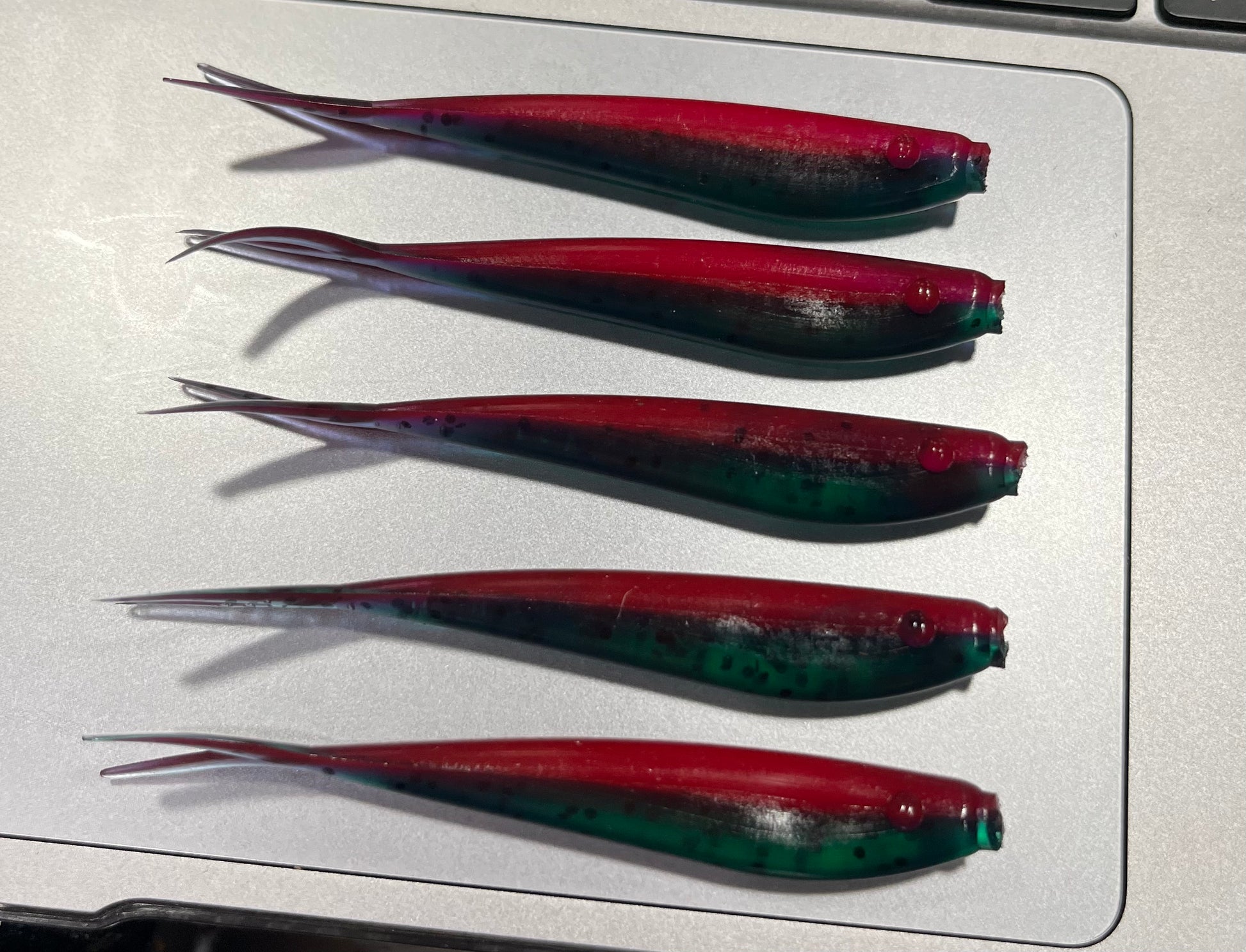 Engineered to mimic injured baitfish, the Watermelon Crush excels in both clear and stained water, making it a must-have in every angler’s arsenal. Whether you’re working shallow structure for spotted bay bass, bouncing sandy flats for halibut, or targeting calicos and other inshore predators, this bait’s lifelike profile and balanced action make it irresistible.
